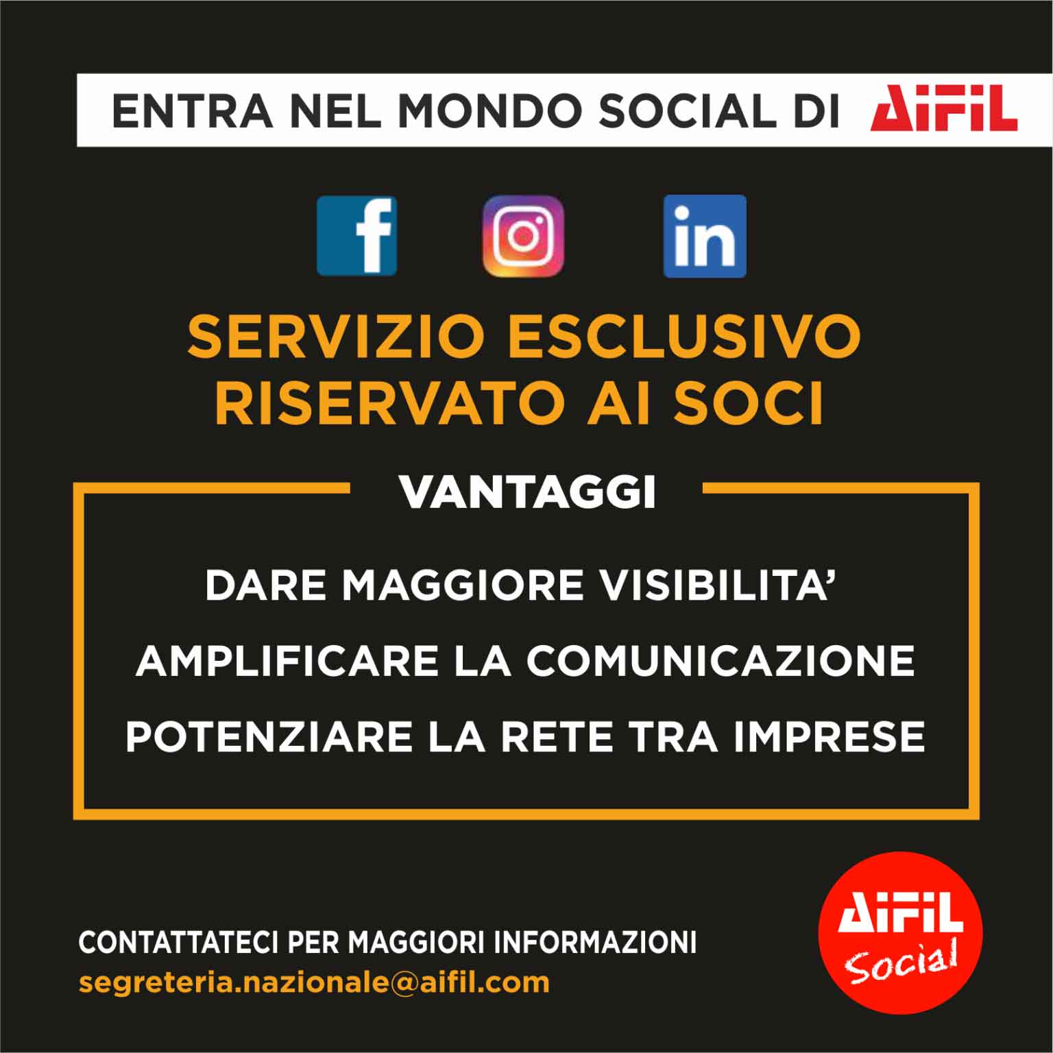 come avete potuto notare negli ultimi mesi, AIFIL ha intrapreso un importante rinnovamento e miglioramento della sua presenza sulle piattaforme Social, oramai diventate fondamentali per la crescita e lo sviluppo d’impresa.